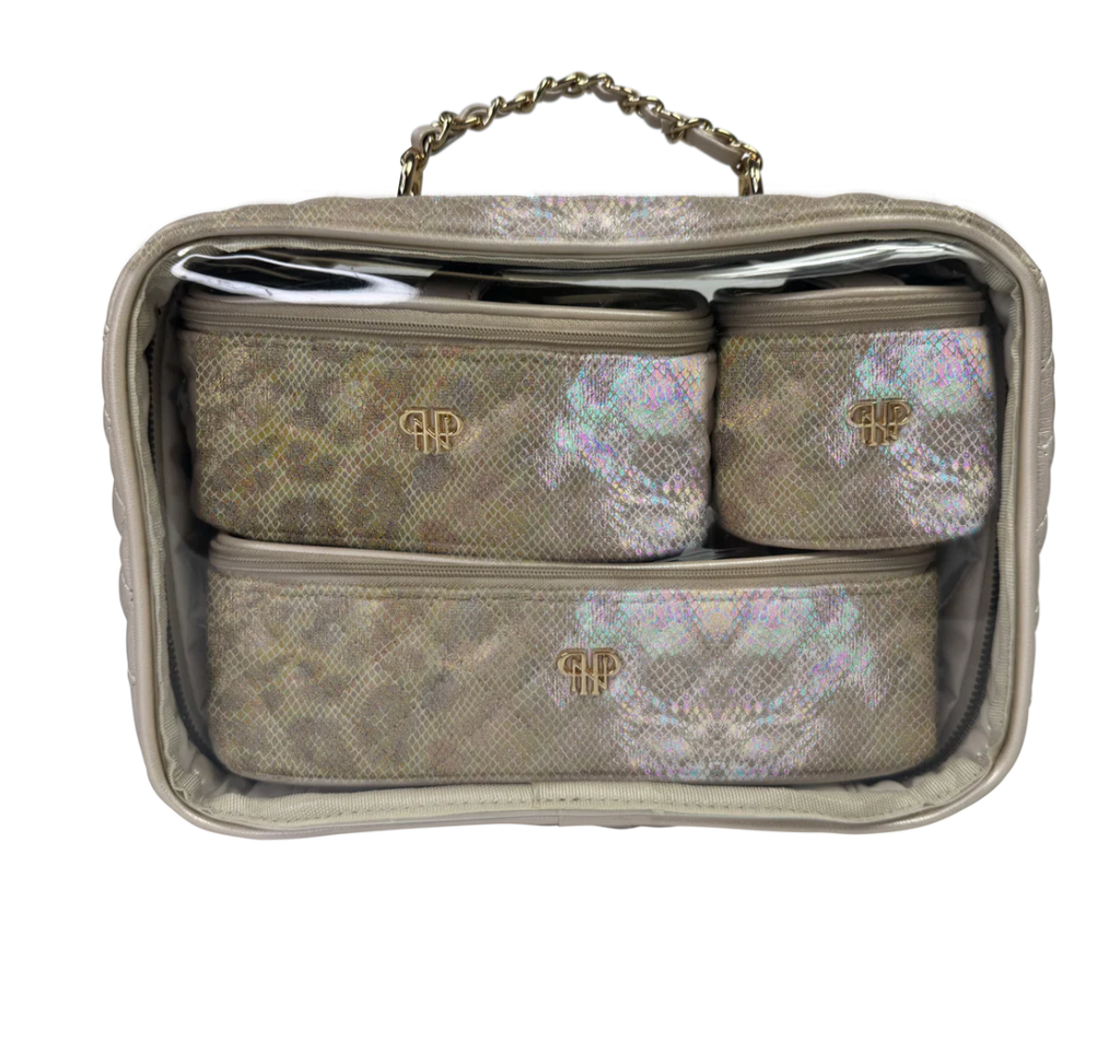The Trio Jet Setter is your four-in-one answer to beauty on the go - elegant, organized, and effortlessly chic. The chic Glimmer Leopard takes sophisticated to a whole new level. Inside the clear, structured case with designer inspired chain handle are three removable companion cases (extra small, small, and medium), perfectly sized to keep your makeup, skincare, and everyday essentials in flawless order. Whether you're heading to the office, the gym, or a weekend escape, the Trio Jet Setter keeps everything in place - and your routine looking fabulous every step of the way.