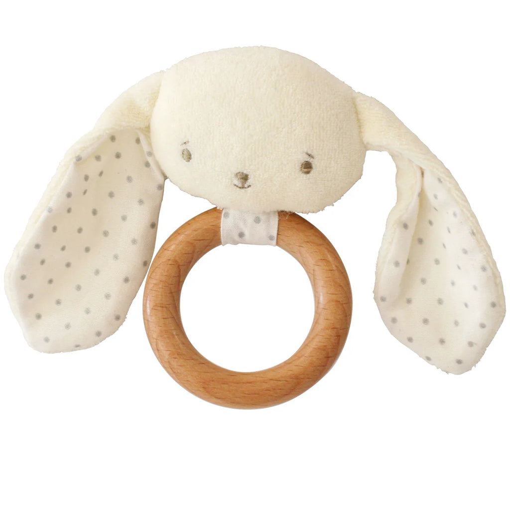 Soothe sore gums and delight little hands with the charming Alimrose Bunny Teether Ring. Featuring a smooth natural beechwood ring that’s gentle on gums and a soft fabric bunny head with a sweet built-in rattle, this teether is both practical and playful.