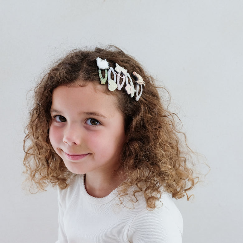 Add a touch of countryside fun with these playful Farm animal mini clic clacs! Featuring adorable designs of a chicken, heart, sheep, flower, and mouse, these cute clips are perfect for brightening up any hairstyle or outfit with a fun farmyard vibe. 5 in a pack 4cm clic clac clips wrapped in a mix of glitter, grosgrain and suedette fabrics Animals, flower and heart crafted from a mix of soft suedette and gold metallic fabrics