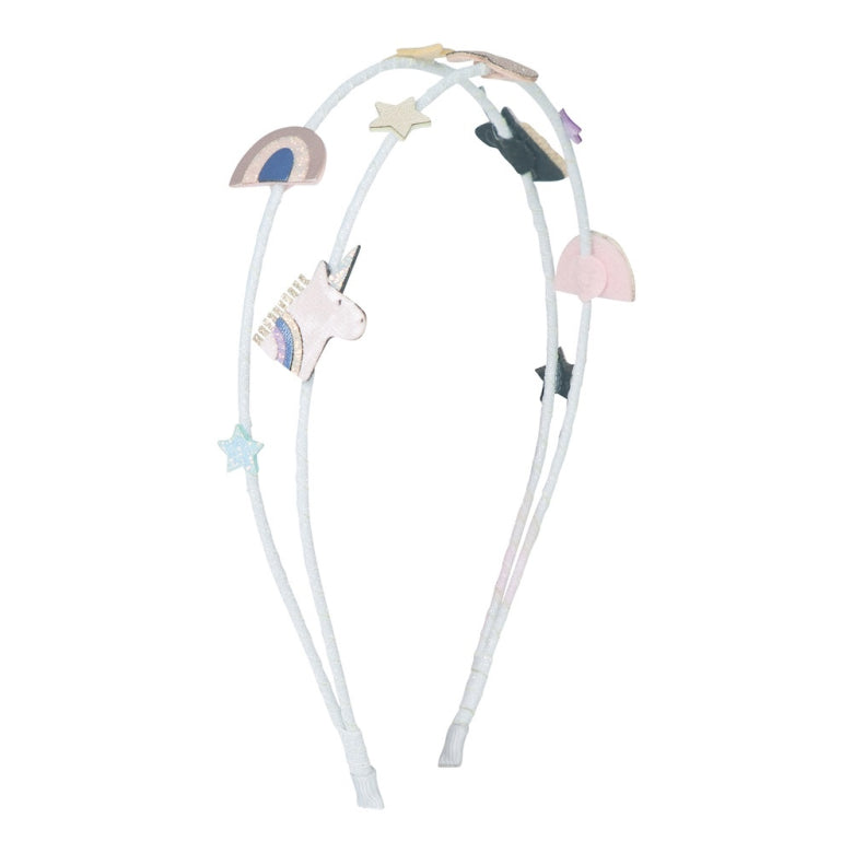 Add some mythical magic to their hair with our Celeste unicorn double alice! Super soft unicorns, rainbows, stars and hearts come together in the prettiest pastel palette for a look they'll love! Alice band sized to fit ages 3-10 years Two pale blue glitter ribbon wrapped rows adorned with unicorns, rainbows, stars and hearts crafted from a pretty mix of soft velvet, glitter and metallic fabrics