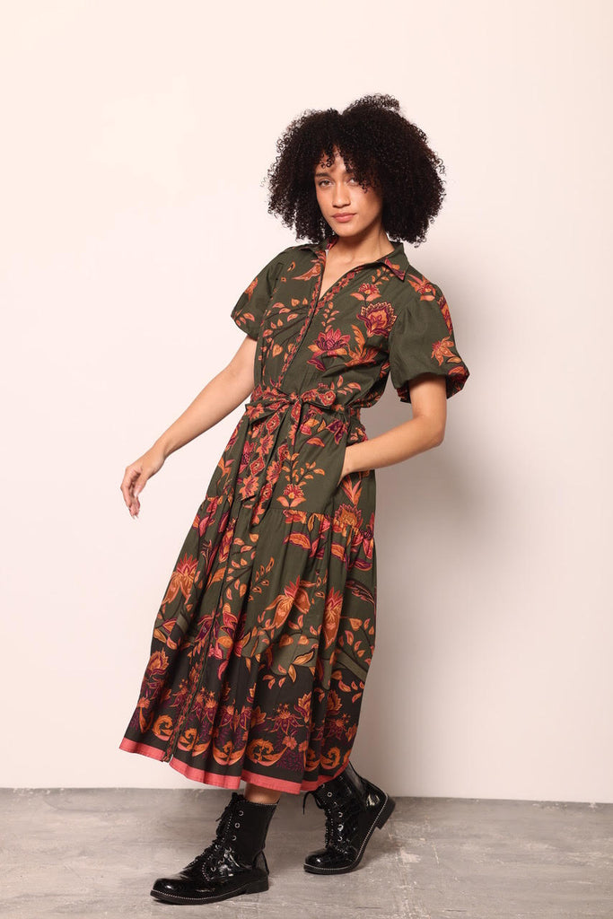Effortlessly fresh and full of charm, the Della Olive Trails Dress is your go-to piece for easy elegance. Crafted from 100% breathable cotton. The collared neckline and button-down front give it a polished touch, while the adjustable waist tie cinches gently for a flattering silhouette.