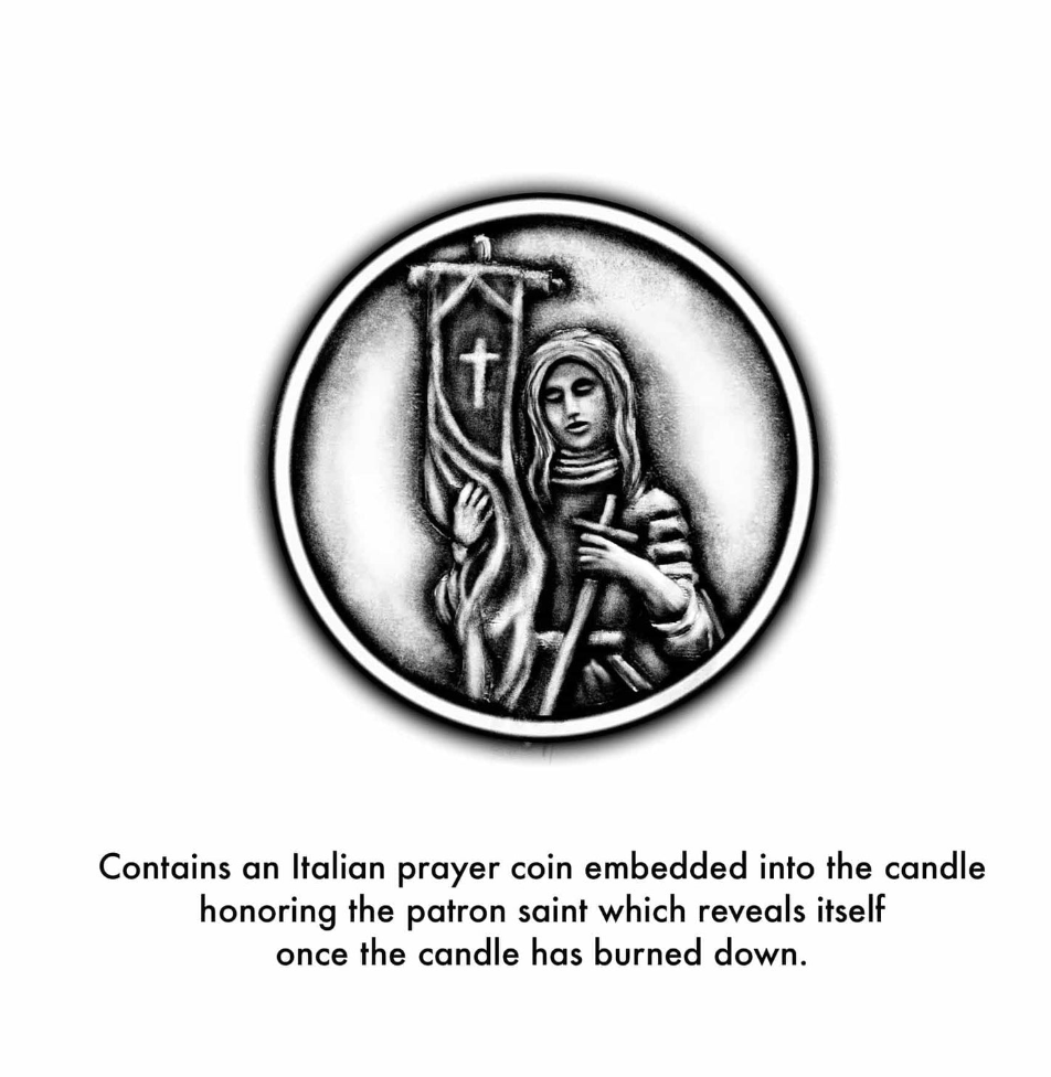 Each candle comes with a prayer to the patron saint, holy oil as part of the wax, and a prayer coin embedded into the candle. Before the first lighting, read out loud the prayer to the patron saint, then light the candle. Once the wax has burned all the way down after many uses, remove the coin at the bottom and keep it in your wallet, purse, or car - or bury it in your yard as a way of blessing the entire household.