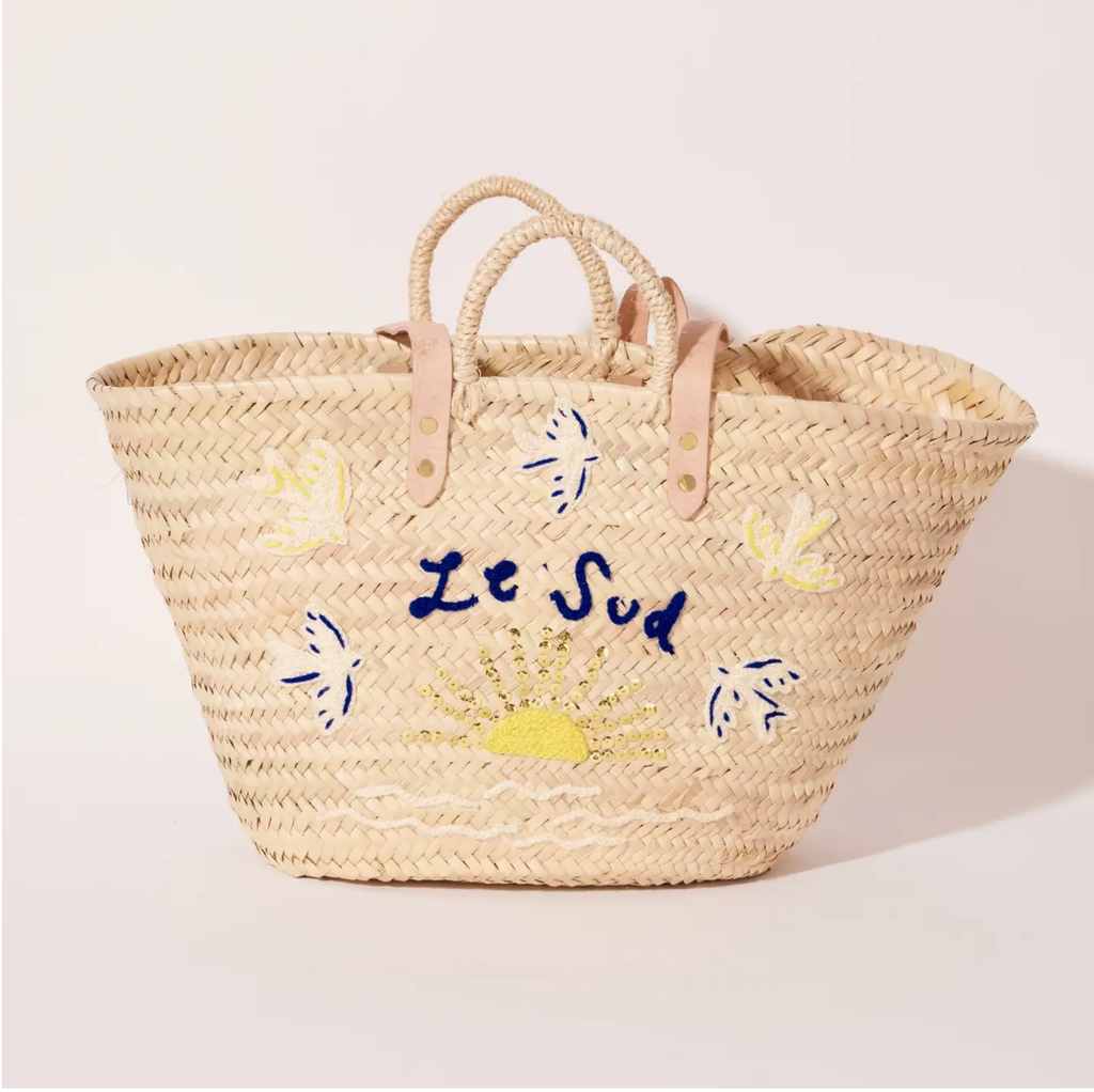 Wicker basket embroidered with wool thread and sequins in a "Le Sud" rising sun motif. Natural color leather handles.