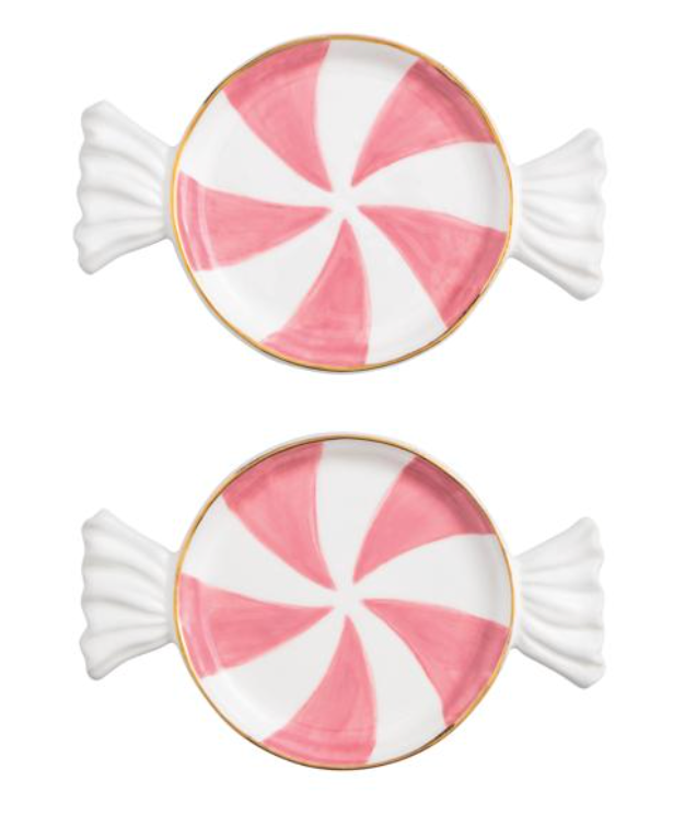 Add a touch of festive charm to your table setting with this delightful set of two Pink Candy Tidbit Plates. Each plate is crafted in the shape of a peppermint candy, bringing a whimsical and cheerful vibe to any occasion. The plates are made from high-quality dolomite, ensuring durability and a smooth finish. Hand-painted gold rims add an elegant touch, making these plates perfect for both casual gatherings and more formal holiday celebrations. Measuring 4 inches by 6 1/4 inches, they are ideal for serving small treats, appetizers, or desserts. Whether you're hosting a holiday party or simply enjoying a cozy evening at home, these tidbit plates are sure to impress your guests and enhance your dining experience.