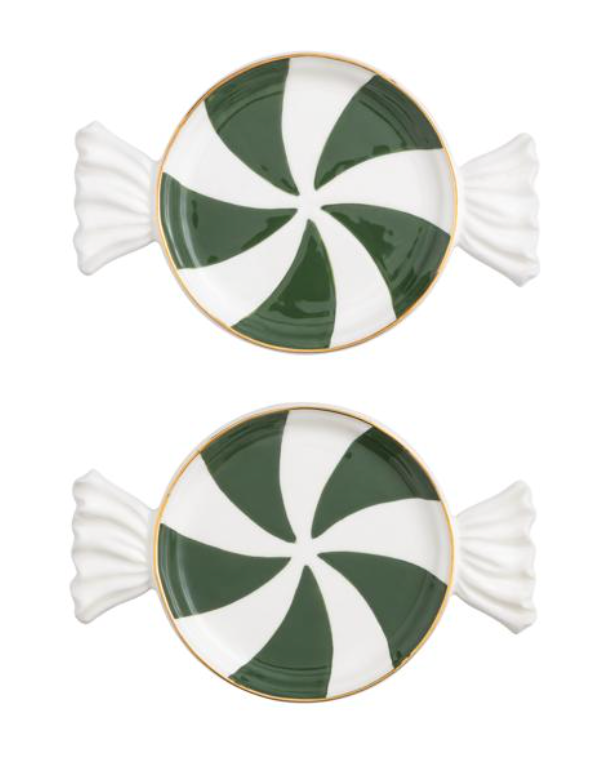 Add a touch of festive charm to your table setting with this delightful set of two Green Candy Tidbit Plates. Each plate is crafted in the shape of a peppermint candy, bringing a whimsical and cheerful vibe to any occasion. The plates are made from high-quality dolomite, ensuring durability and a smooth finish. Hand-painted gold rims add an elegant touch, making these plates perfect for both casual gatherings and more formal holiday celebrations. Measuring 4 inches by 6 1/4 inches, they are ideal for serving small treats, appetizers, or desserts. Whether you're hosting a holiday party or simply enjoying a cozy evening at home, these tidbit plates are sure to impress your guests and enhance your dining experience.