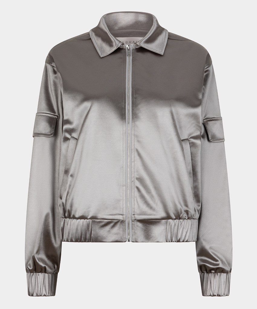Make a bold statement with this silver metallic bomber jacket. Featuring a sleek, modern sheen and a classic sporty silhouette, it adds instant edge to any outfit. Pair it with jeans for a casual-cool look or layer over a dress for a touch of futuristic glam.