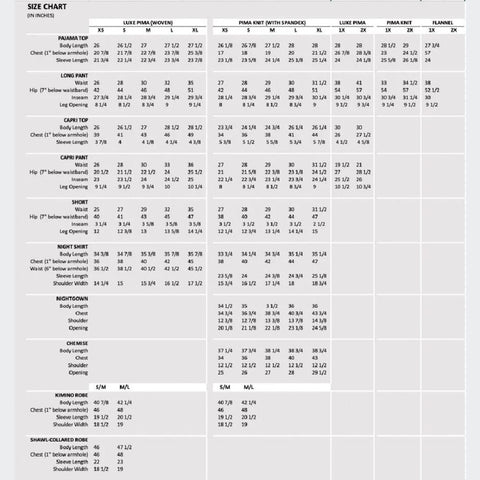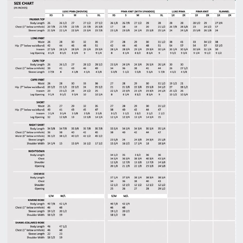 Most people find our sleepwear to be larger than expected. This allows for a comfy fit and room for expected cotton sleepwear shrinkage, which is approximately 1" in width and length.