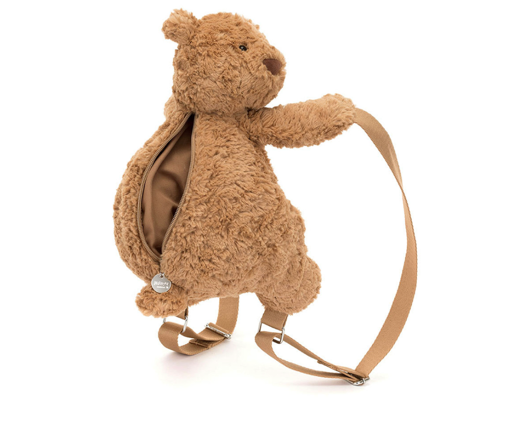 Whether you're off for a forest wander or foraging at the shops, take Bartholomew Bear Backpack. Our tufty, podgy toffee bear has chunky paws and perky ears, with a little tail sticking out. With adjustable straps, a silver zip and a gentle lining, this bag is a portable hug.
