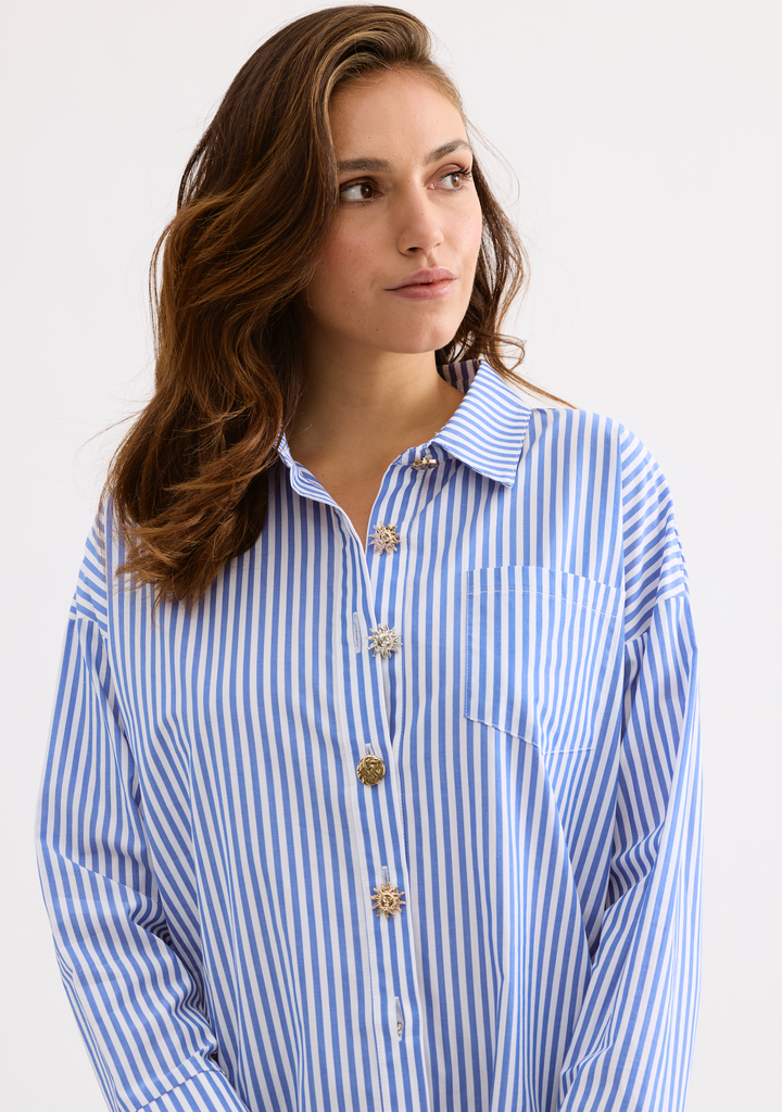 The striped ROSIE shirt in 100% cotton charms with its fresh and timeless look. Its natural fabric offers optimal comfort and great breathability, ideal for the season. The vertical stripes enliven the figure, while the golden buttons add an elegant and feminine touch.
