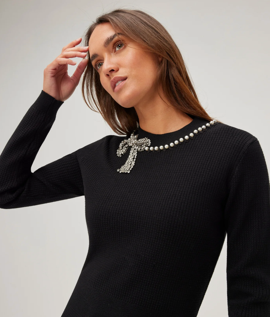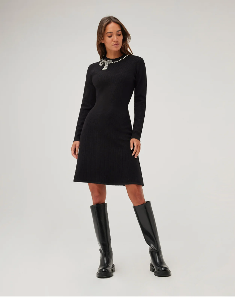 Discover our elegant and feminine ASSIA DRESS. With its mid-length cut fitted at the waist and flared below, this dress will highlight your figure. Its round neck decorated with a sequined bow adds a touch of glamour to this essential piece of your wardrobe.