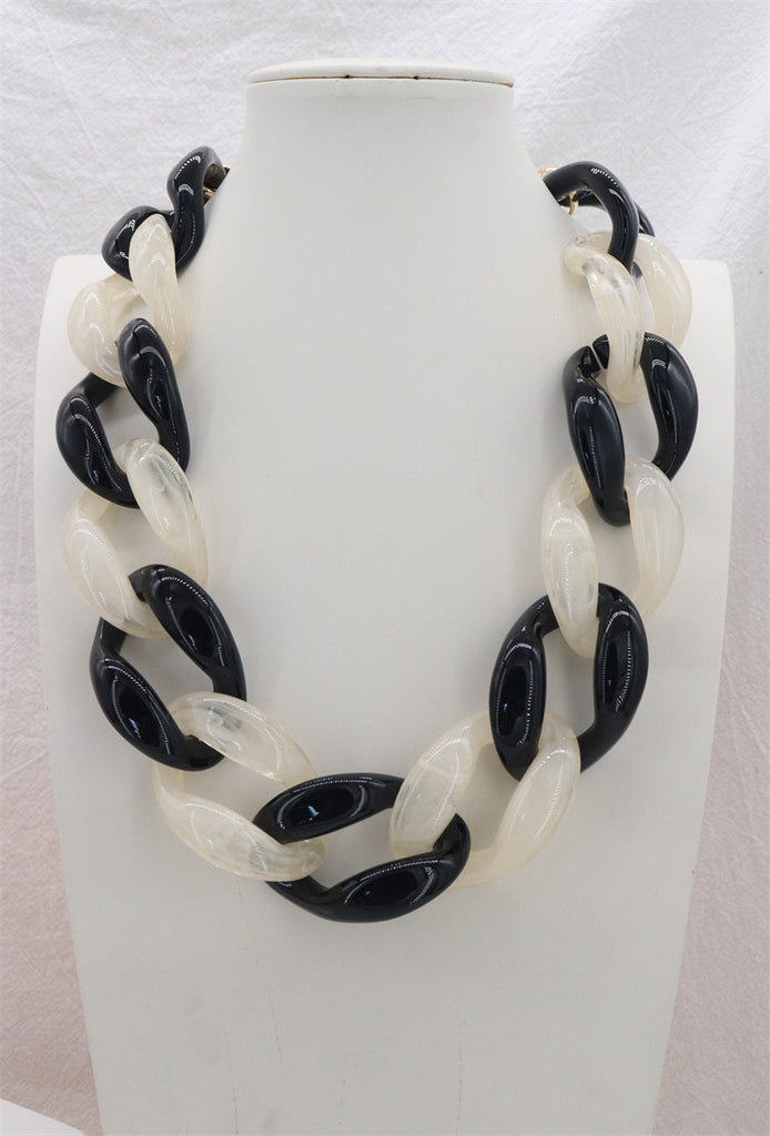 Modern and versatile, this statement necklace features interlinked black, grey, and white acrylic chains. Lightweight yet bold, it’s the perfect accessory to add depth and dimension to any outfit—whether dressed up or styled casually.