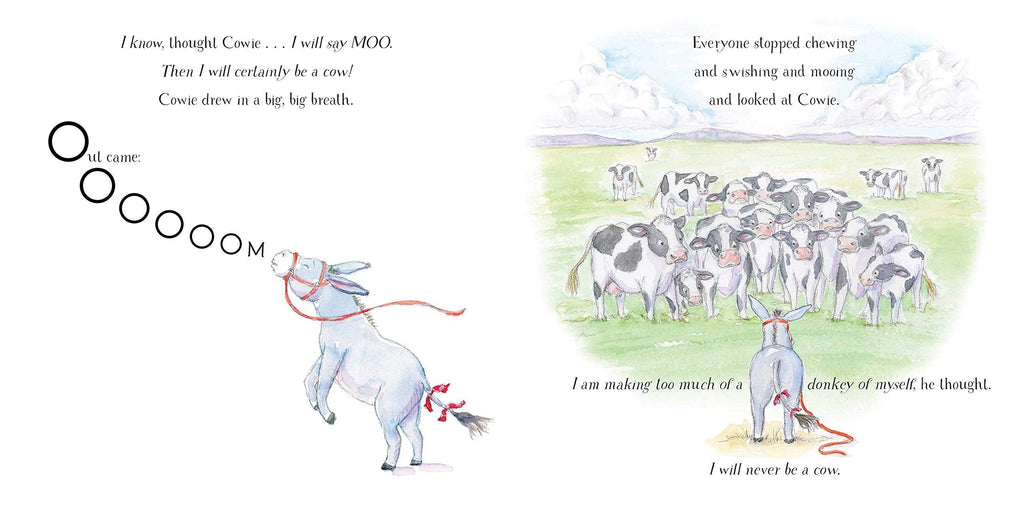 Cowie was born a donkey but he knows he’s meant to be a cow. He wants to be a cow. Cows can graze in the meadow all day long and no one asks them to carry heavy packages. So, he stands with the cows in the barn but nothing happens. Will his dream ever come true, he wonders. Can Mousie and Duckie help Cowie feel happy in his own skin?
