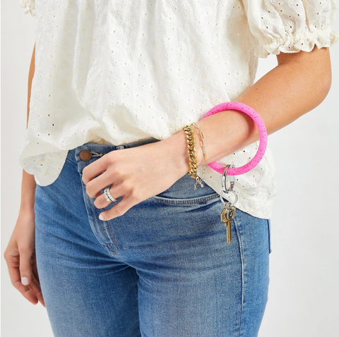 The silicOne Big O Key Ring is 3.75 inches in diameter and fits over your wrist, helping even the most active women stay hands-free. Top quality silicOne comes in a collection of bold, bright, stylish hues, are water repellent and non-toxic. They are an excellent accessory for beach, pool, and fitness-focused women. Our patent-pending design and sturdy signature clasp won't break a sweat and easily hooks up with all our O-ssential accessories.