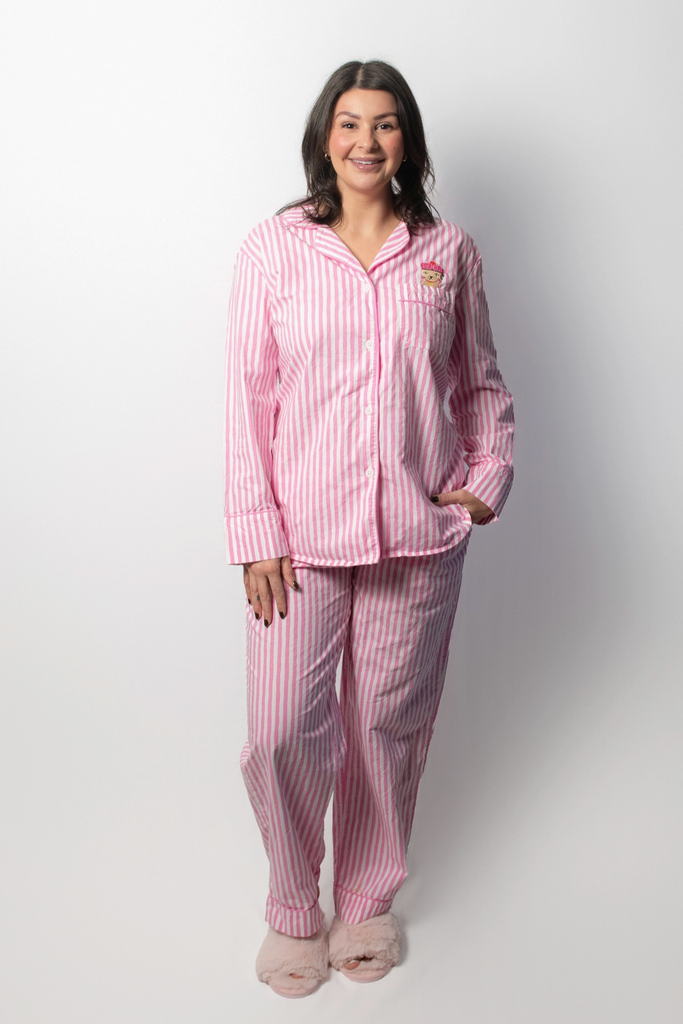 Pink Striped Pajama Set, crafted from 100% cotton for unmatched comfort and style. Featuring soft pink stripes and an adorable embroidered cat above the pocket, this set adds a whimsical charm to your loungewear. Perfect for cozy nights or as a delightful gift, these pajamas offer breathable fabric and a playful design, ensuring a restful and stylish sleep experience. Care Instructions: Machine wash cold, gentle cycle. Do not bleach. Tumble dry on low. Warm iron if needed. Pre-washed for a perfect fit and reduced shrinkage, this pajama set is made to stay comfortable and durable.