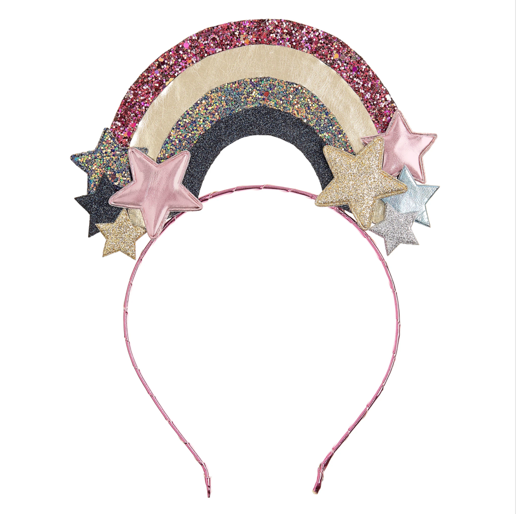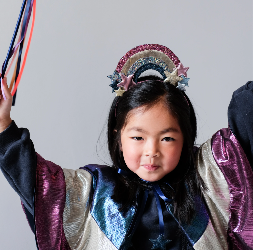 Sparkle and shine with this dazzling rainbow headdress! Made from a combination of fuschia and iridescent chunky glitter, navy fine glitter and metallic gold leatherette fabrics, the shimmering rainbow bursts out from clusters of stars in a mix of metallic and glitter fabrics. This headdress has a fuchsia metallic leatherette wrapped headband and is the perfect headdress for any celebration!