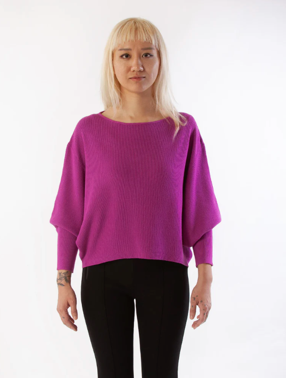 Loose Fitted Boat Neck Top in Fine Rib Stitch with Long Dolman Sleeves