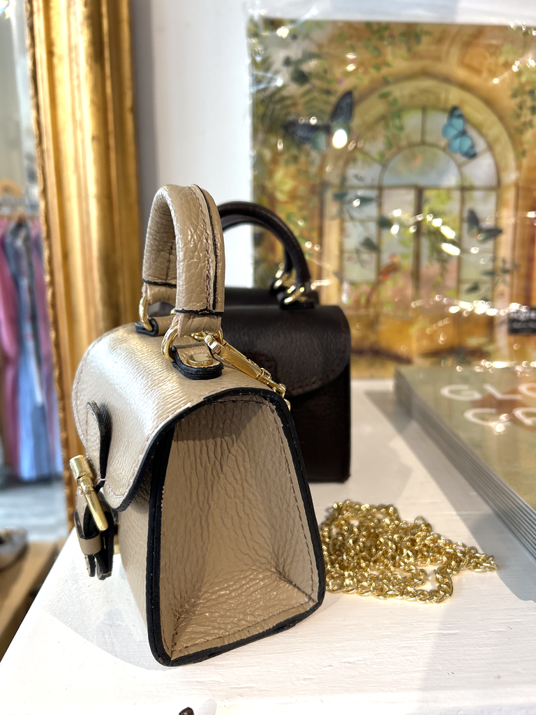 Small Purse Charm-Taupe. It comes with a gold crossbody chain.