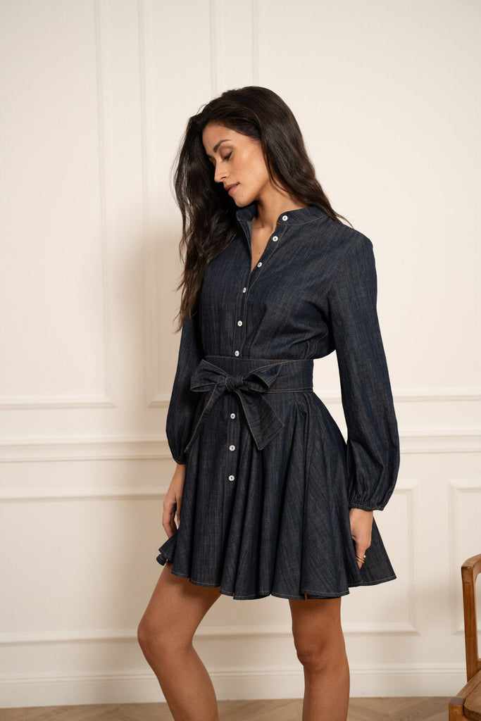 Our Sonia dress in its new denim fabric. Skater dress with a waist belt: - Skater shape cut - Front button placket - Removable belt in main material - Contrasting embroidery - Printed polyester fabric embroidered with cotton threads When worn, it has a very nice volume and does not go unnoticed.