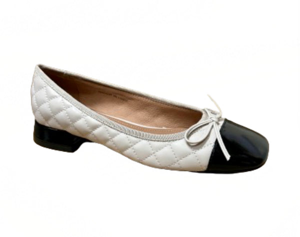 A diamond-quilted pattern defines a timeless ballet flat with patent cap toe and slender bow.